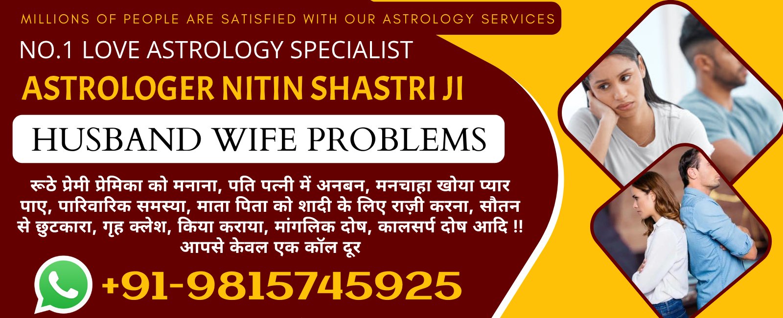 प्रेम विवाह ,शादी मे समस्या , ग्रह कलेश , पति पत्नी मे अनबन , सौतन से छुटकारा , सास को काबू करना , प्यार में धोखा खाये प्रेमी प्रेमिका एक बार अवश्य संपर्क करें